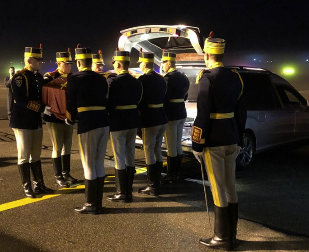 „Acum 30 de minute, la ora 7 (ora României), de la Aeroportul Geneva a decolat avionul militar „Spartan”, aparţinând Forţelor Aeriene Române. Aeronava aduce din Elveţia în România sicriul cu osemintele Reginei-Mamă Elena. În prezenţa secretarului de Stat Victor Opaschi, a IPS Mitropolitului Iosif, a dlui Ioan Luca Vlad (Consiliul Regal) şi a doamnei Constanţa Iorga (Casa Majestăţii Sale), sicriul drapat cu stindardul Reginei-Mamă a fost urcat la bord cu onoruri militare”, anunţă, pe Facebook, Familia Regală a României.