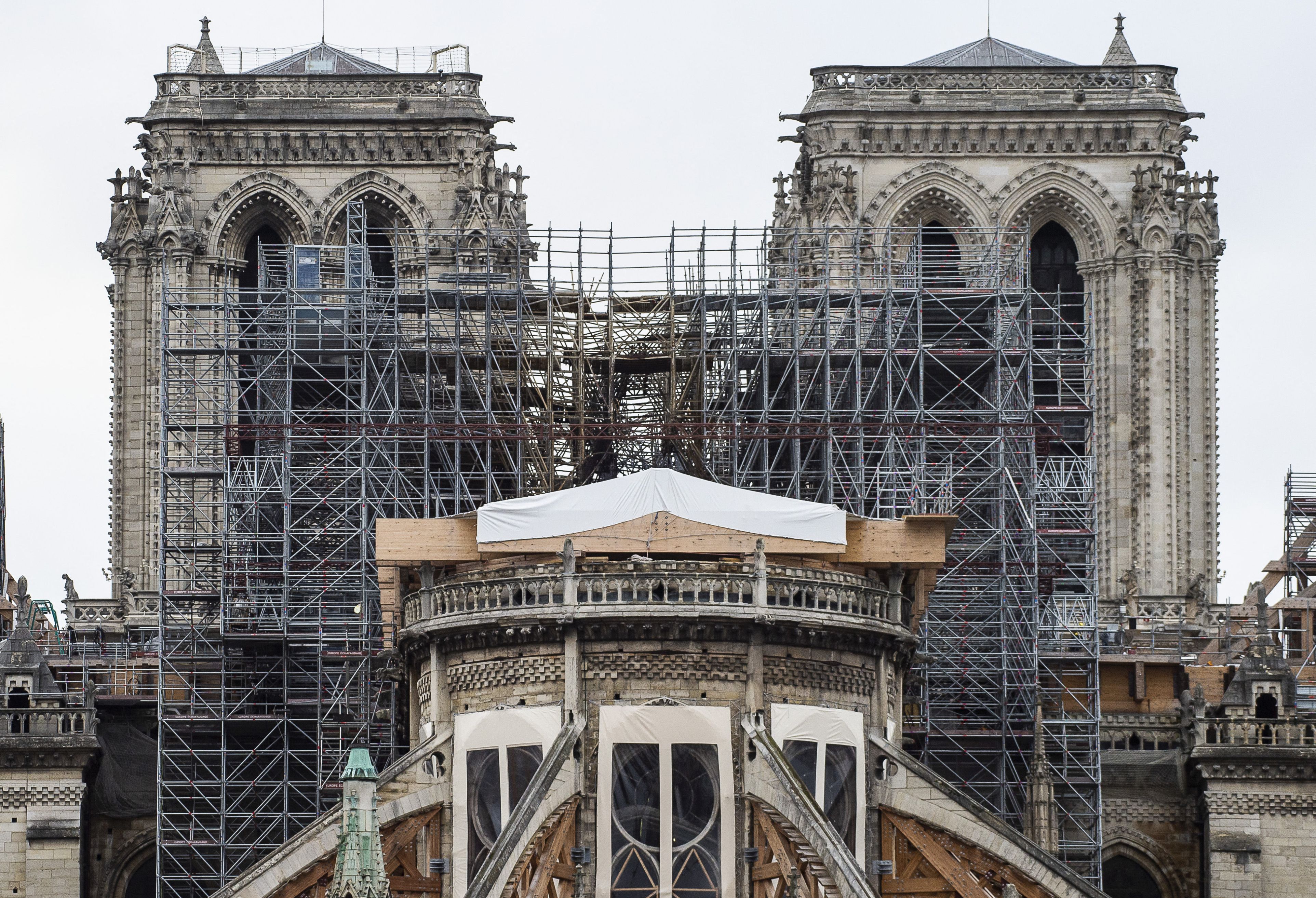 O nouă macara, înaltă de 75 de metri şi-a făcut apariţia în apropierea catedralei parţial distruse. Prima operaţiune debutează în luna februarie când va începe înlăturarea schelelor instalate pentru renovarea planificată chiar înainte să se producă dezastrul. Nu mai puţin de 250 de tone de materiale de construcţii afectate de incendiu trebuie să fie acum extrase din catedrală.”Nu ştim în ce fel va fi afectată stabilitatea structurii”; a declarat arhiepiscopia catolică din Paris, care administrează catedrala Notre Dame.